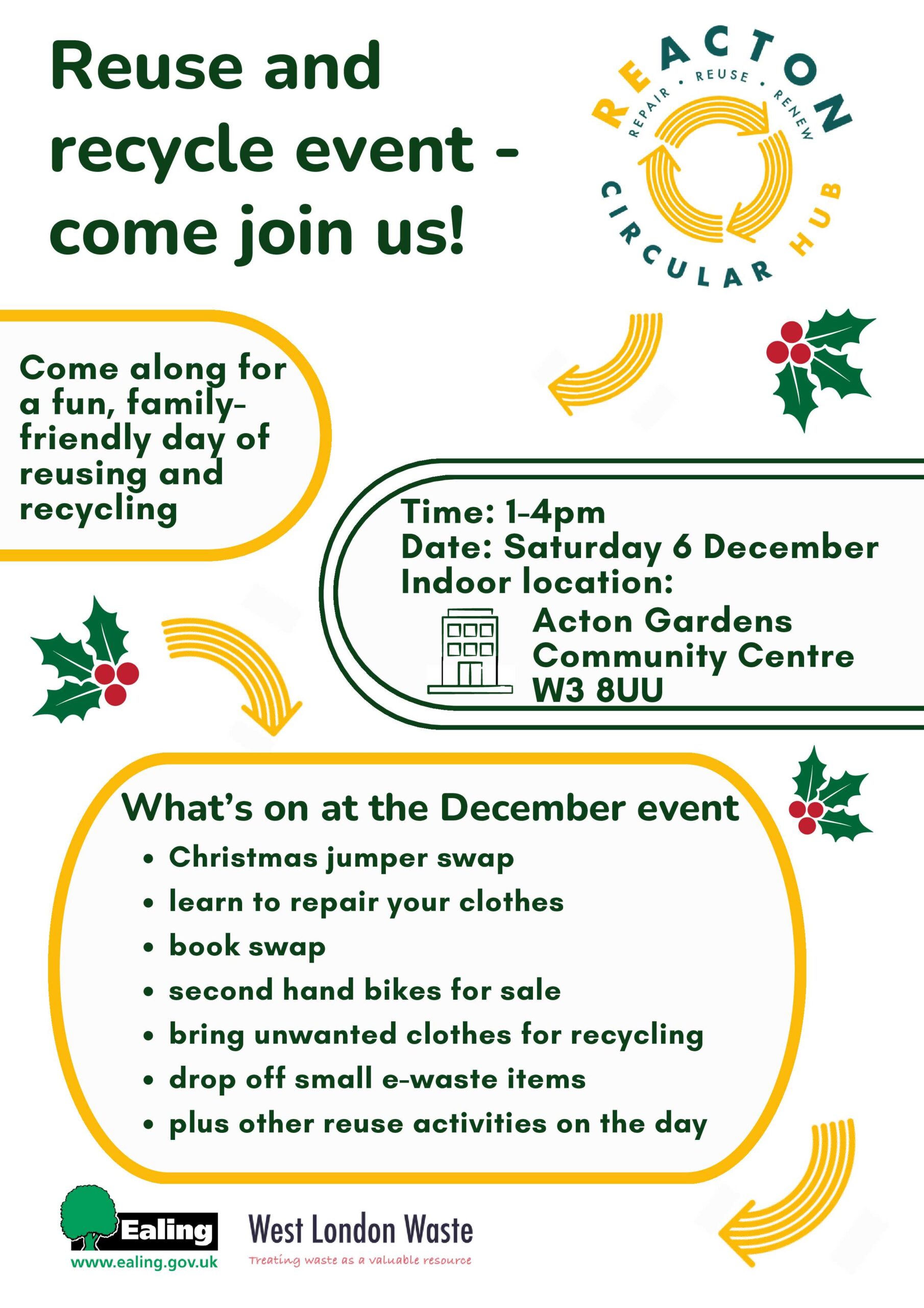 Plus Ealing Repair café will be there to mend your clothes, a book swap to pick up some winter reads and many more waste busting activities.